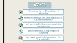 Cloud computing Service Models, Data processing methods, Advantages and Disadvantages, Security Challenges and Evaluation of suitability for Business Industry.